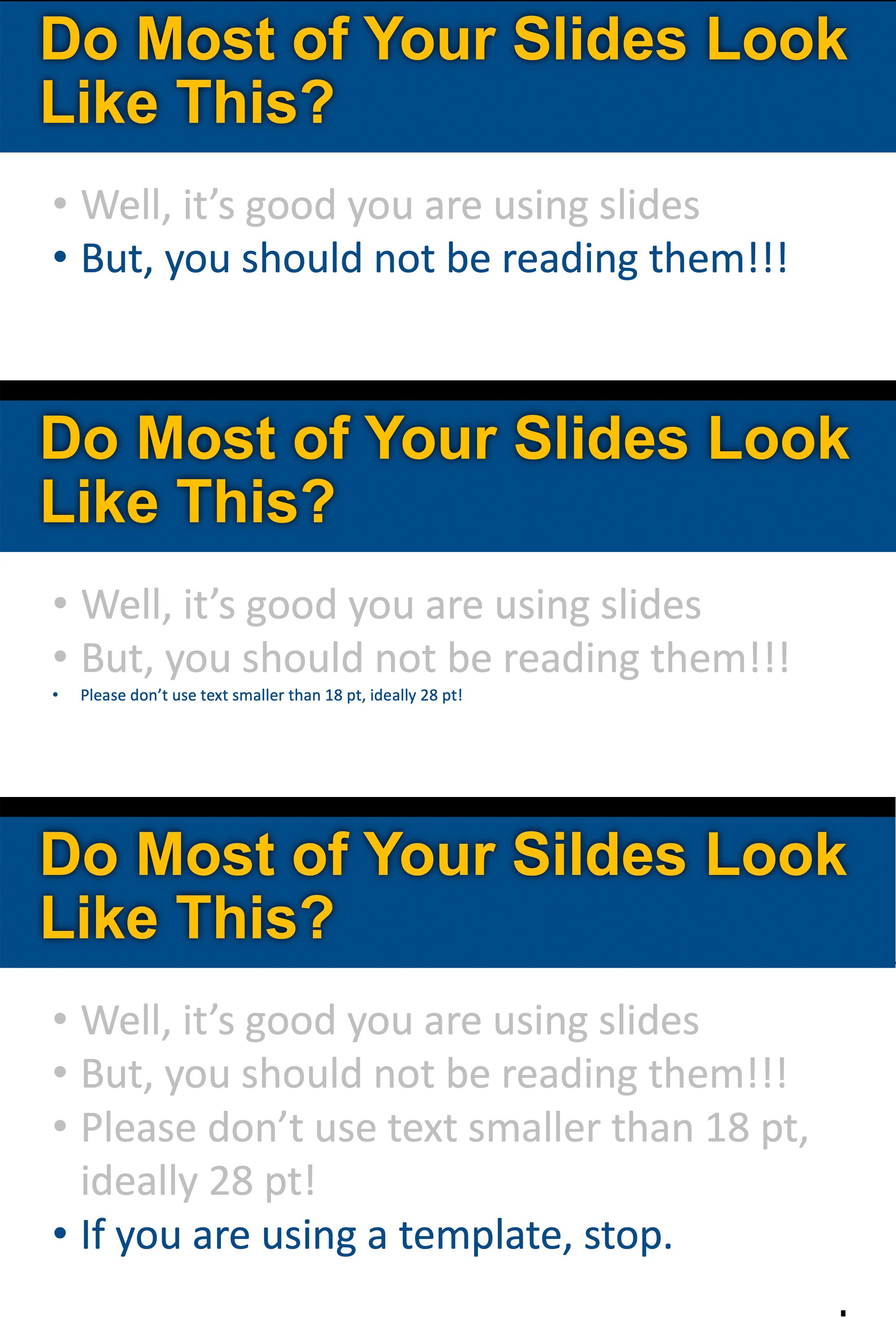 - Show three visually similar slides—yes, you change the titles